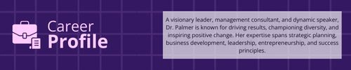 Dr. Palmer's wealth of expertise is a considerable asset to any corporate event or meeting, ensuring both inspiration and education. She is a distinguished speaker and a highly regarded business consultant.